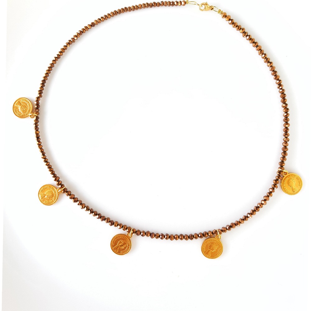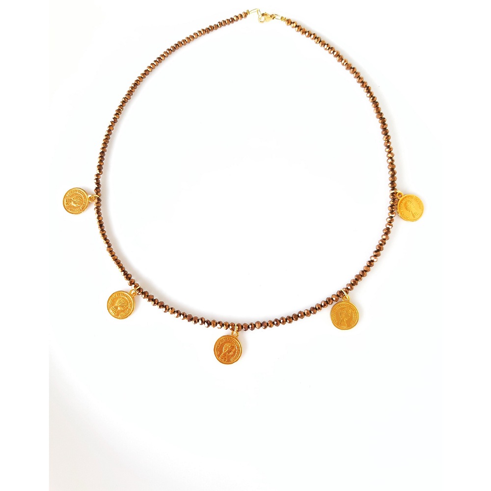 •   Κολιέ 40εκ. σε bronze χρώμα κρυσταλλάκια,ζάμακ επιχρυσωμένα νομίσματα/φλουριά & κούμπωμα από ατσάλι.