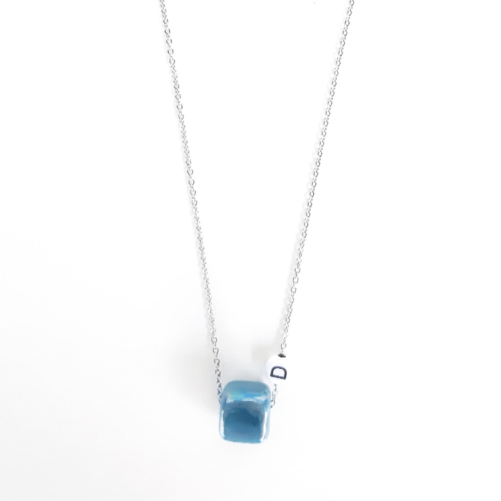 •   Κολιέ με ατσάλινη αλυσίδα σε ασημί χρώμα 45εκ. από ανοξείδωτο ατσάλι(Δεν μαυρίζει) χειροποίητη γυάλινη πέτρα σε blue sky χρώμα .Ακρυλικά γράμματα στα αγγλικά.